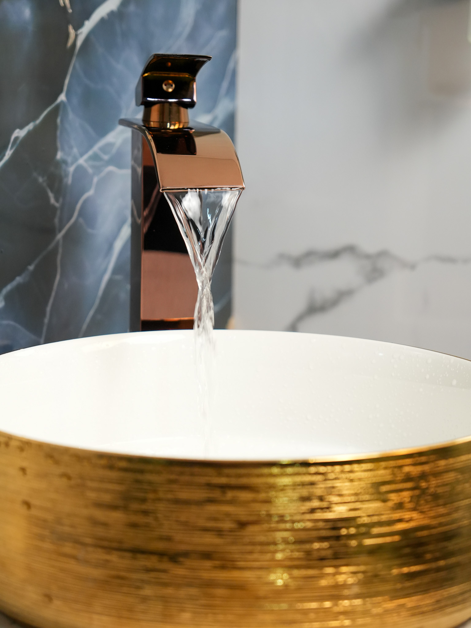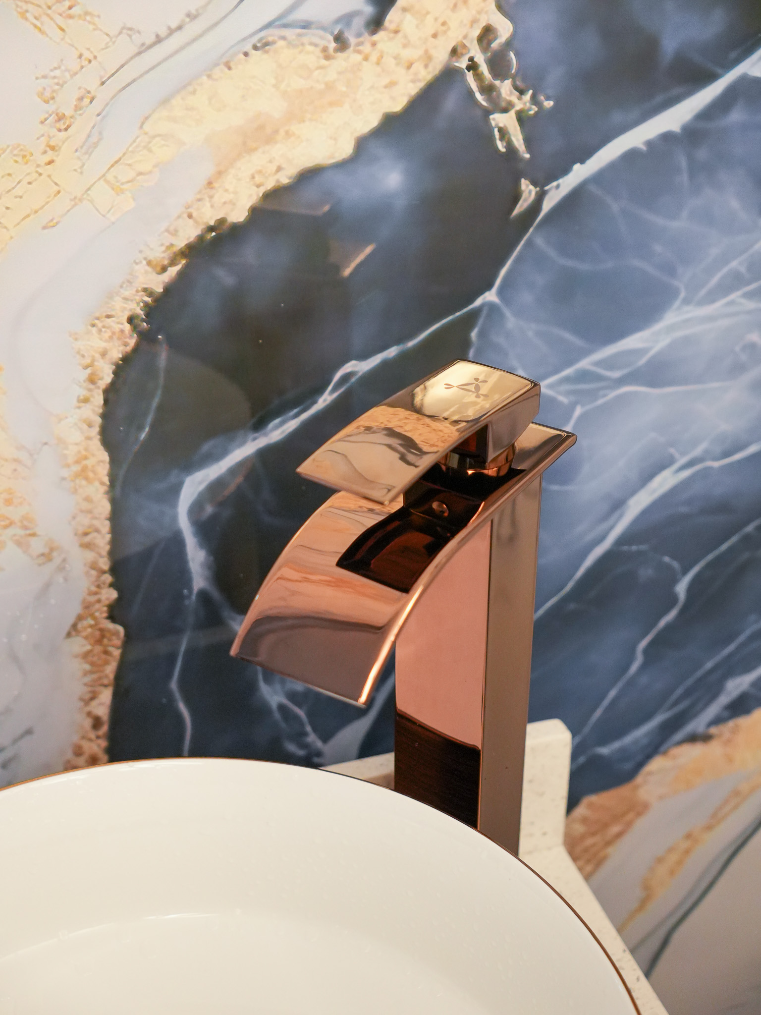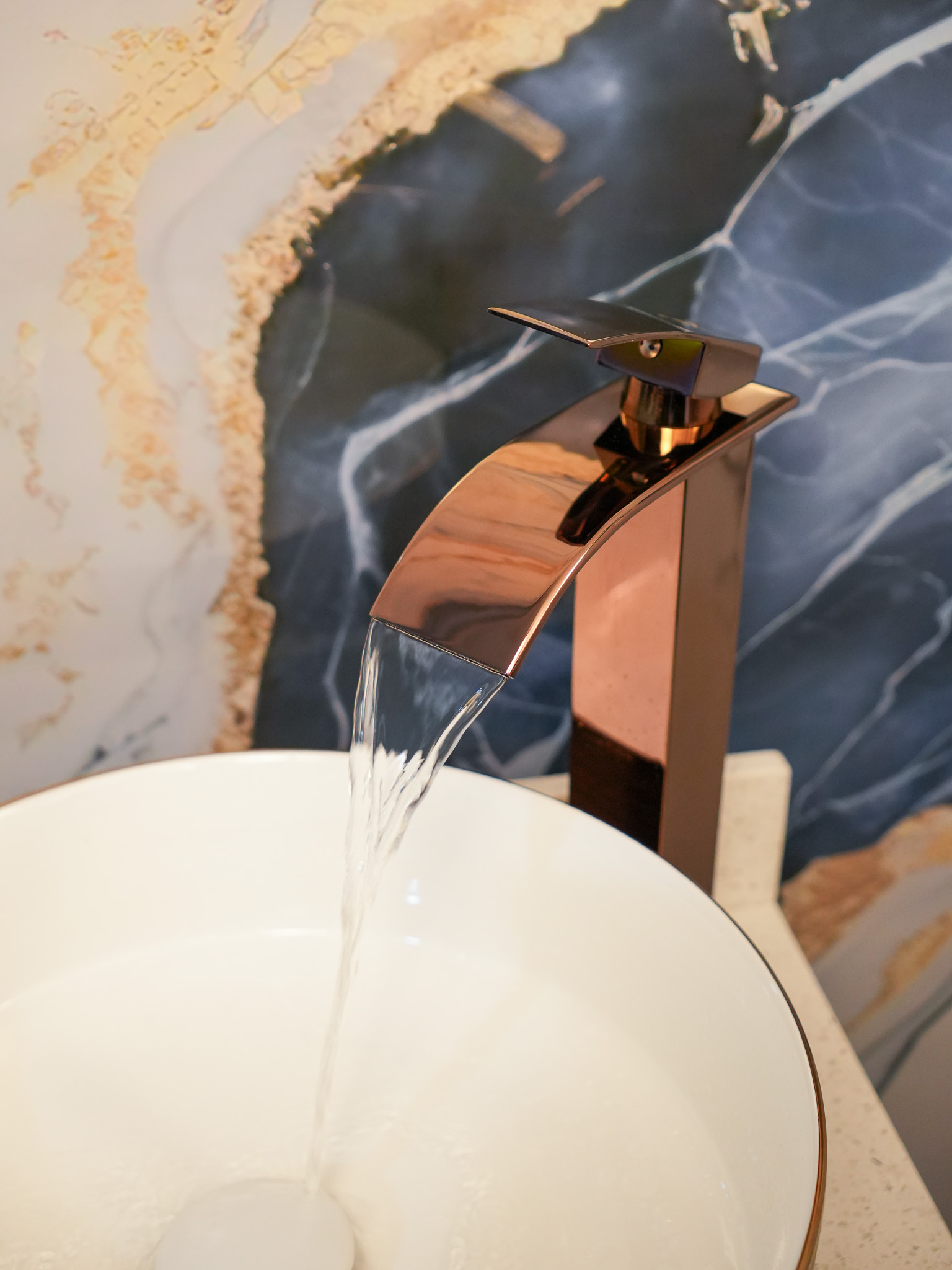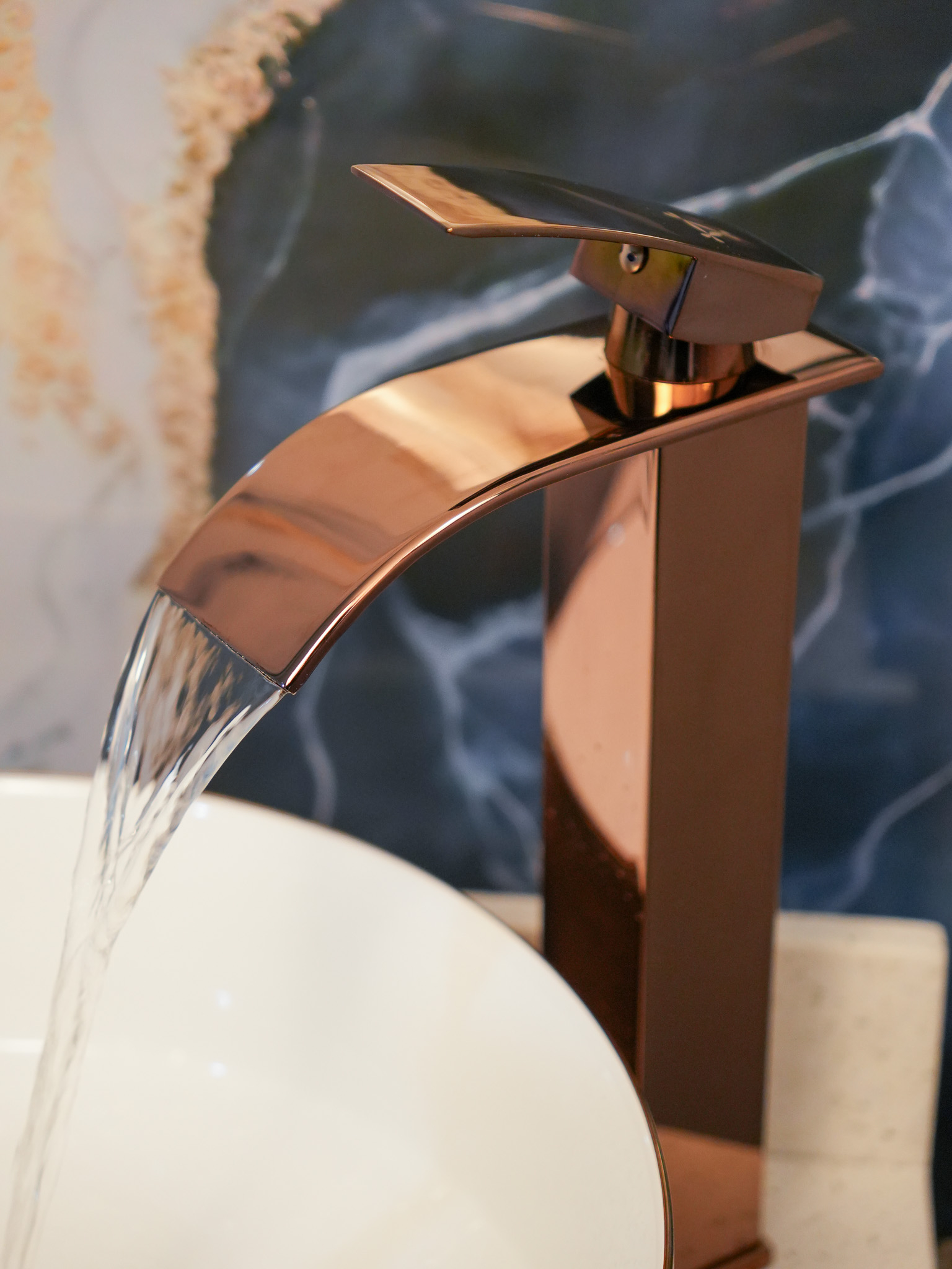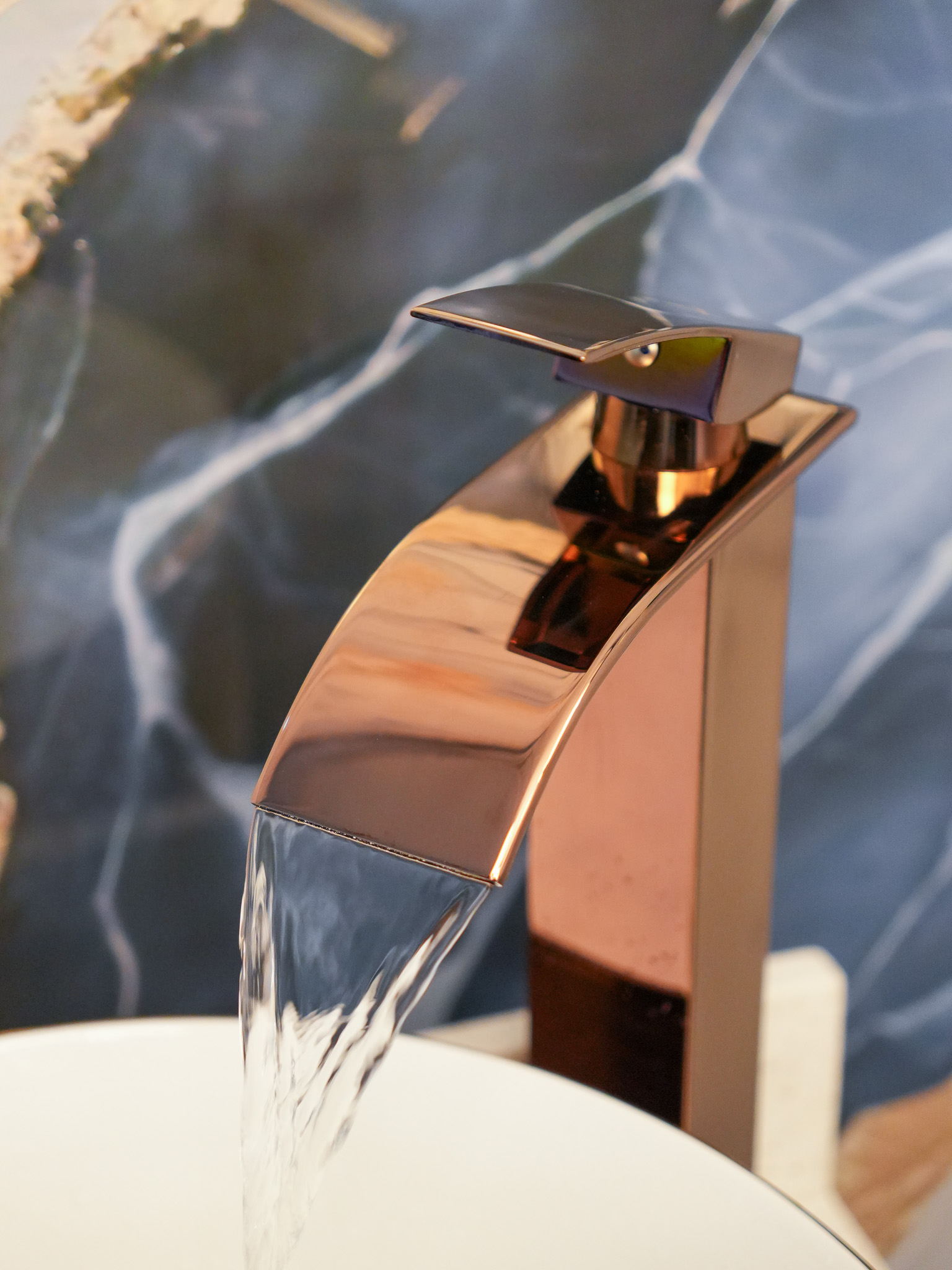 Fabricado en acero inoxidable, salida de agua tipo cascada de lujo, mezclador, agua fría y caliente, acabado oro rosa brillante.