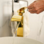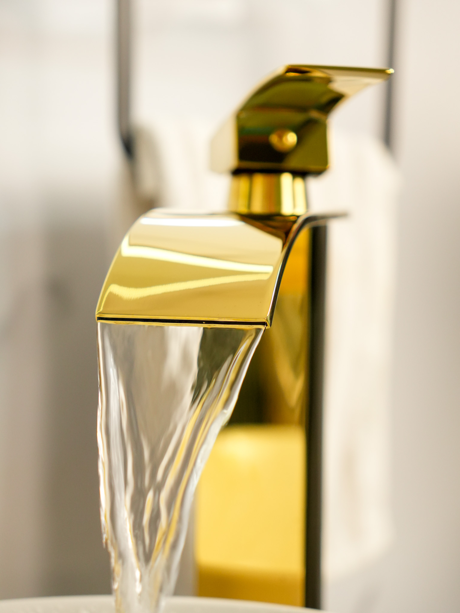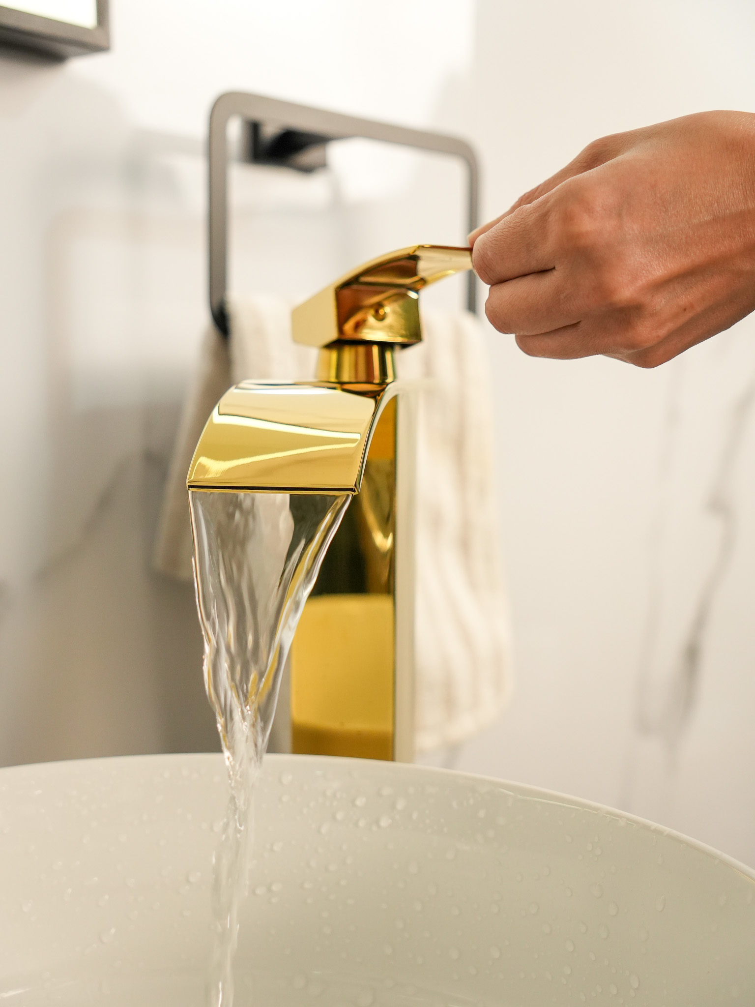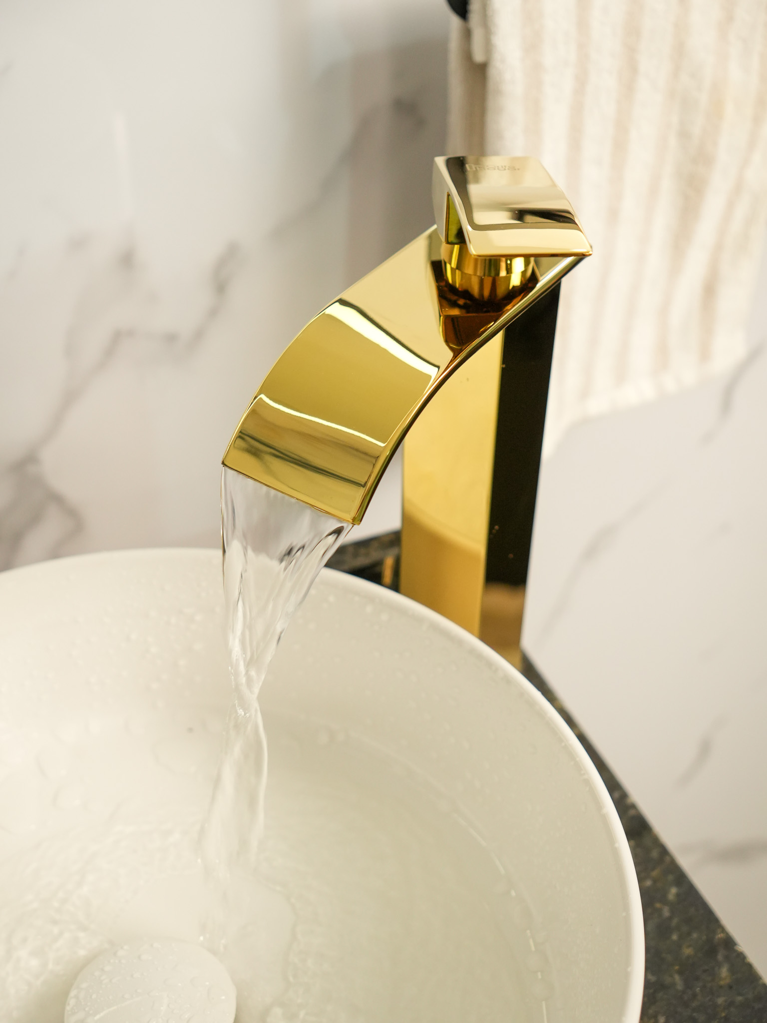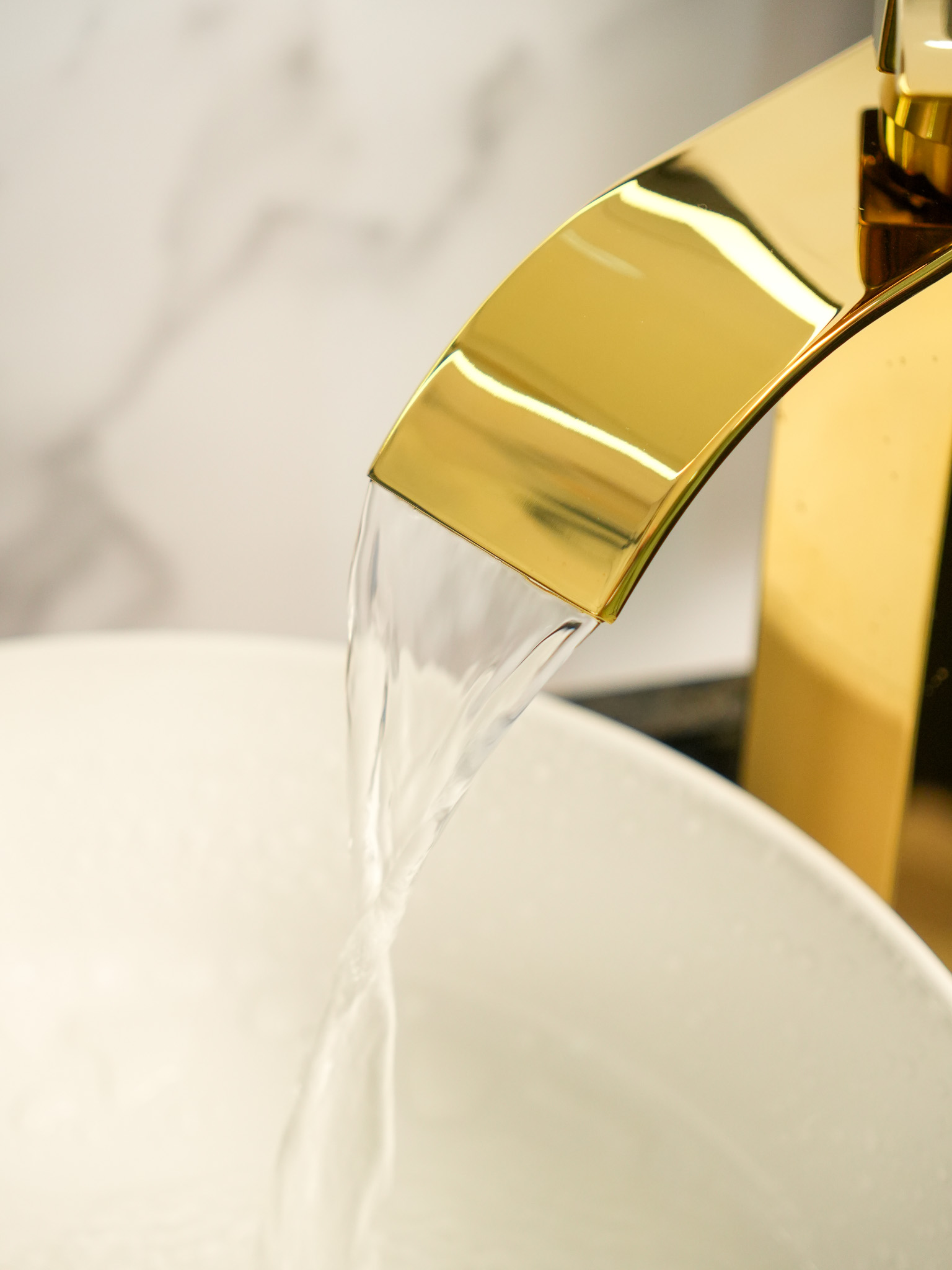 Fabricado en acero inoxidable, salida de agua tipo cascada de lujo, mezclador, agua fría y caliente, acabado oro brillante.