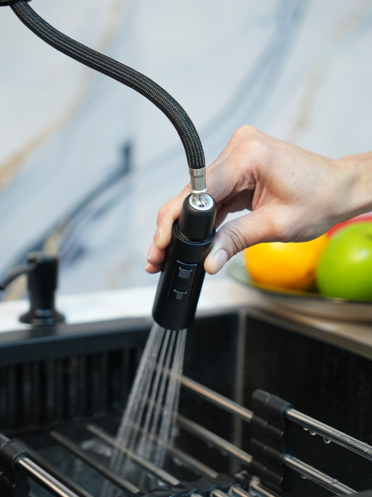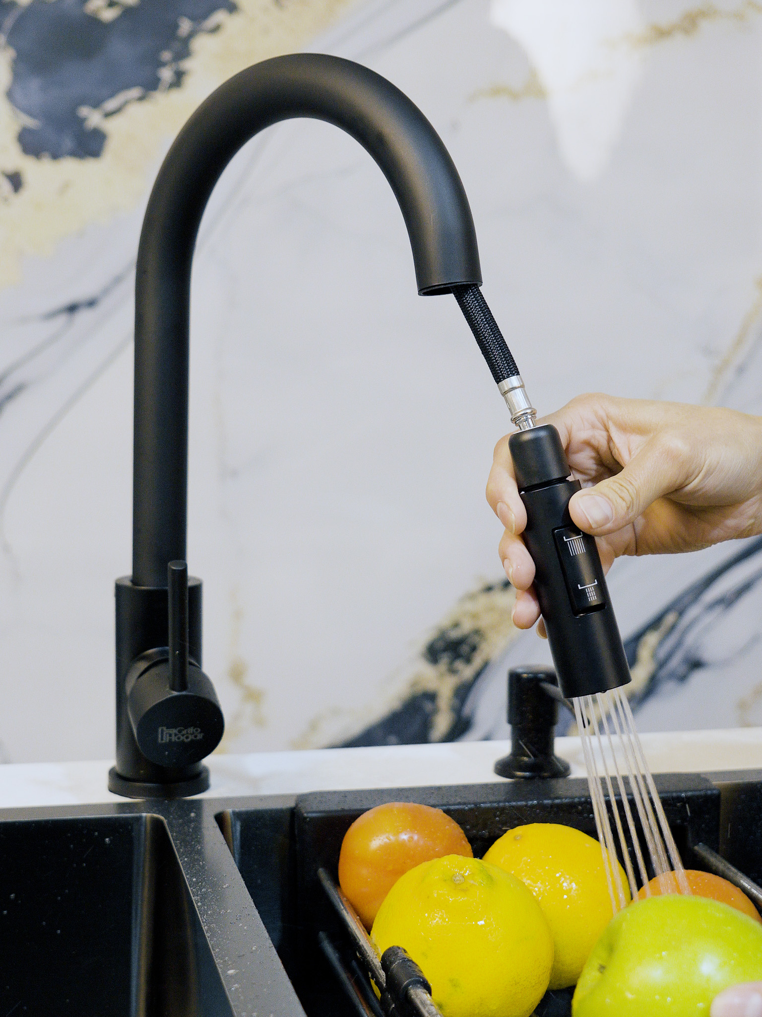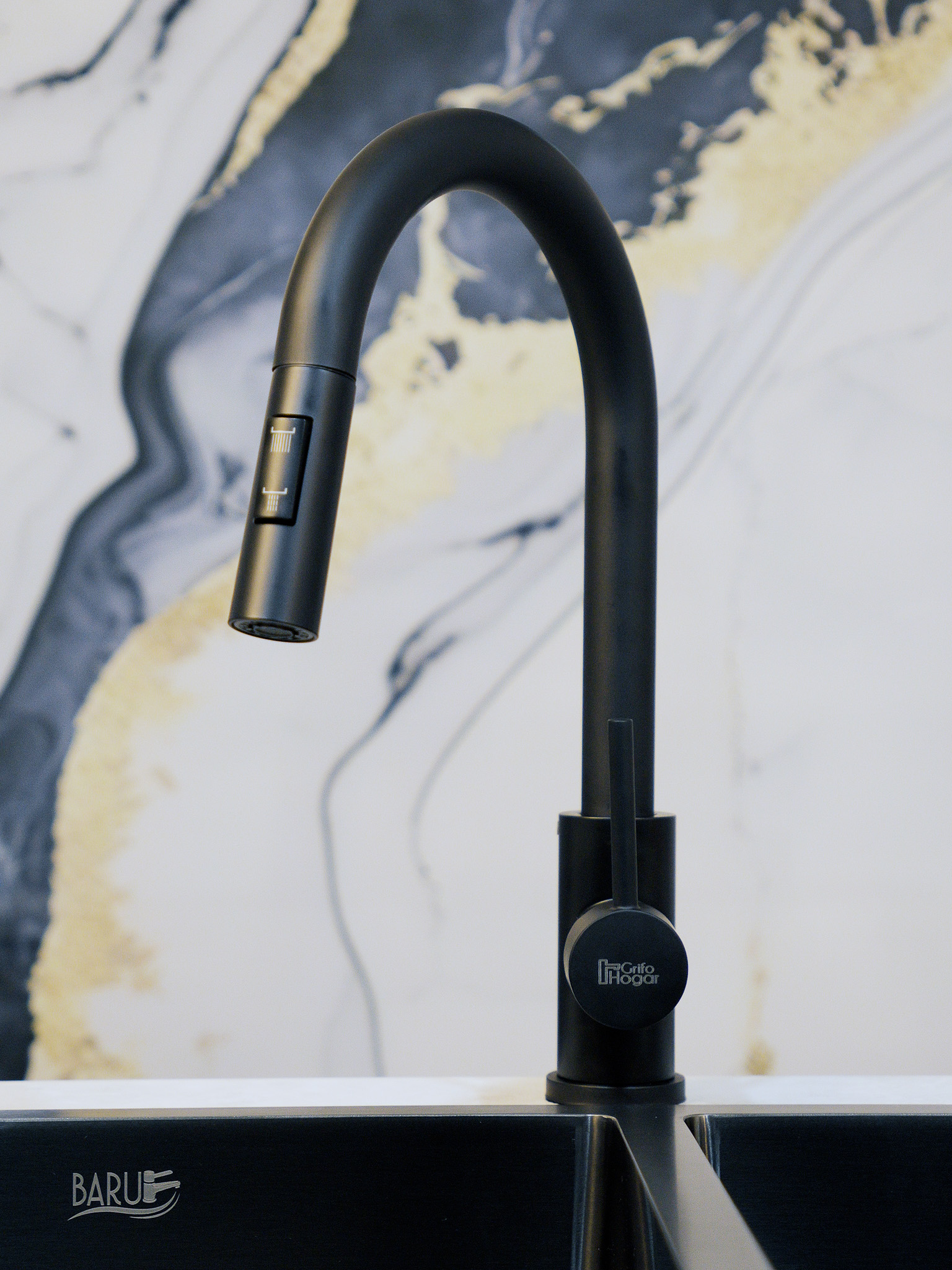 Grifo extraíble fabricado en acero inoxidable 304, extraíble hasta 60cm, poma doble, función chorro y regadera, acabado negro mate.