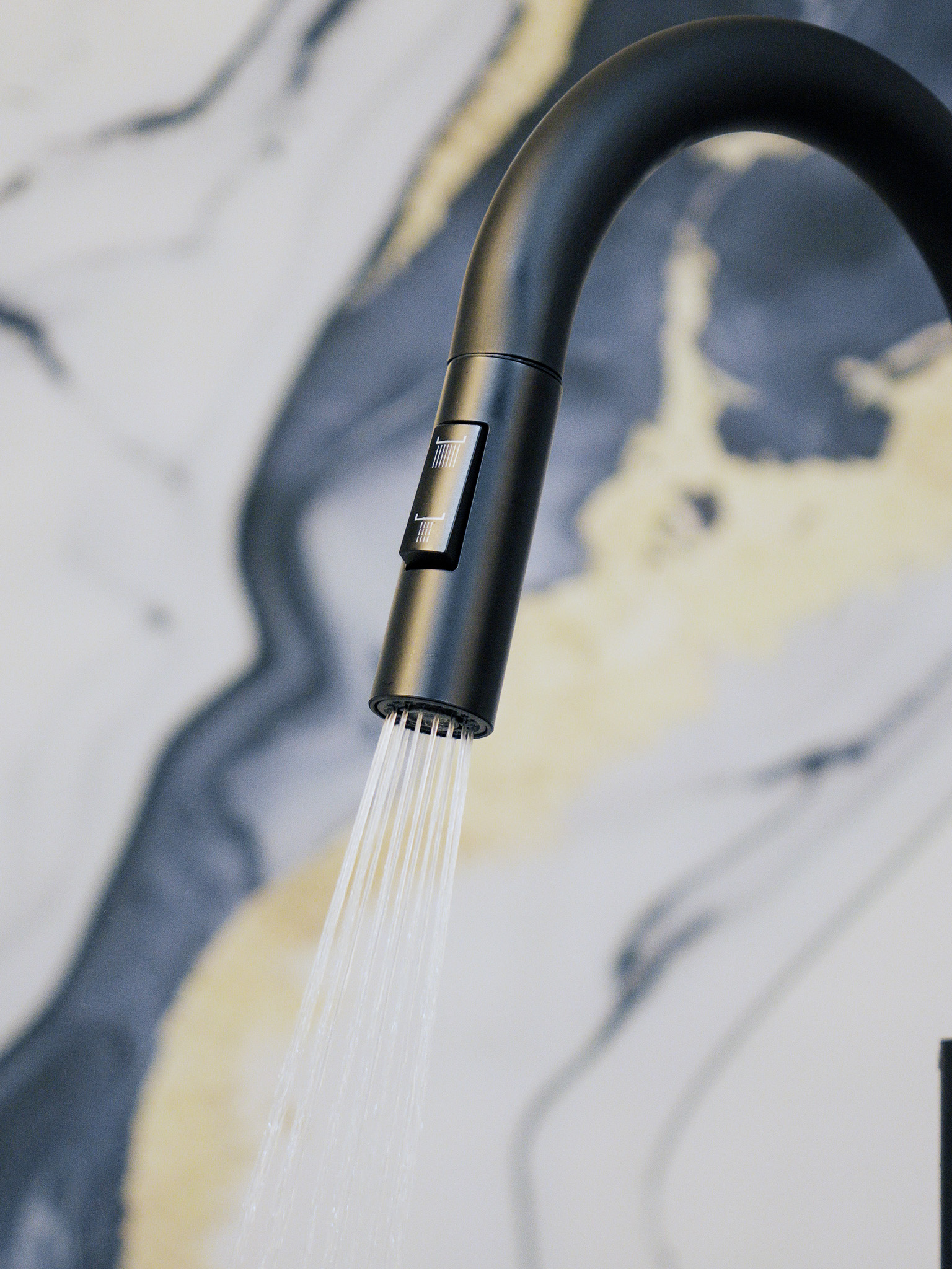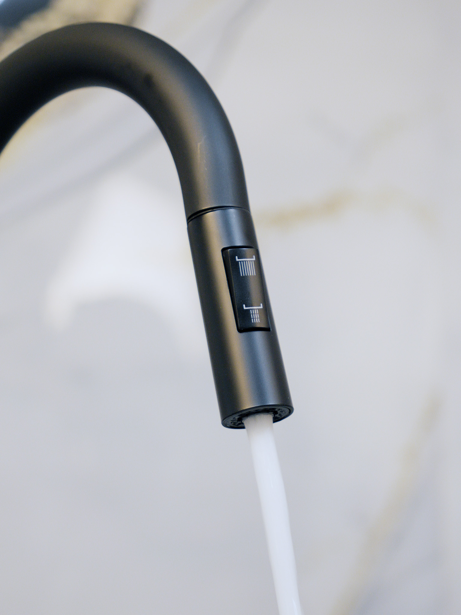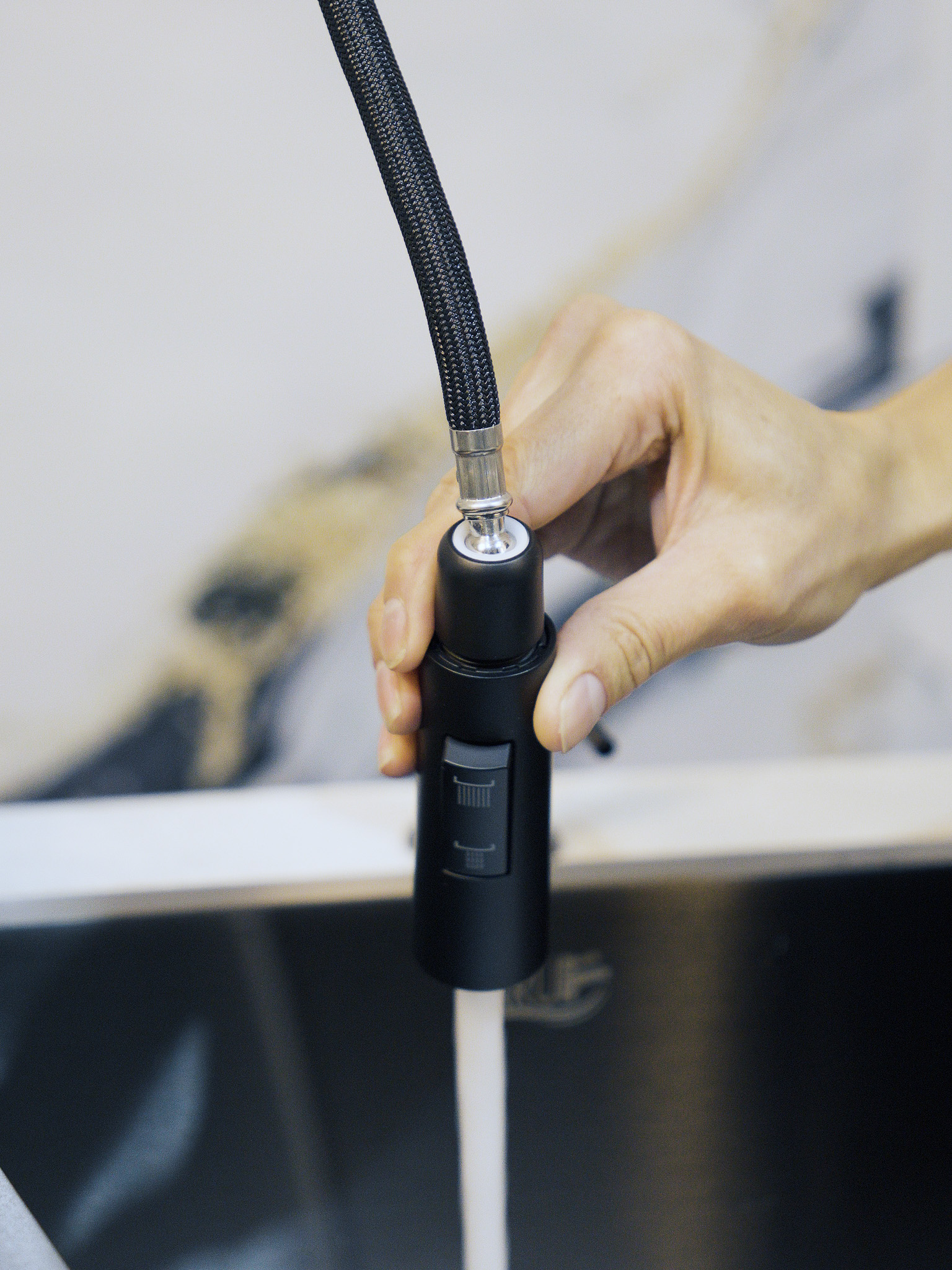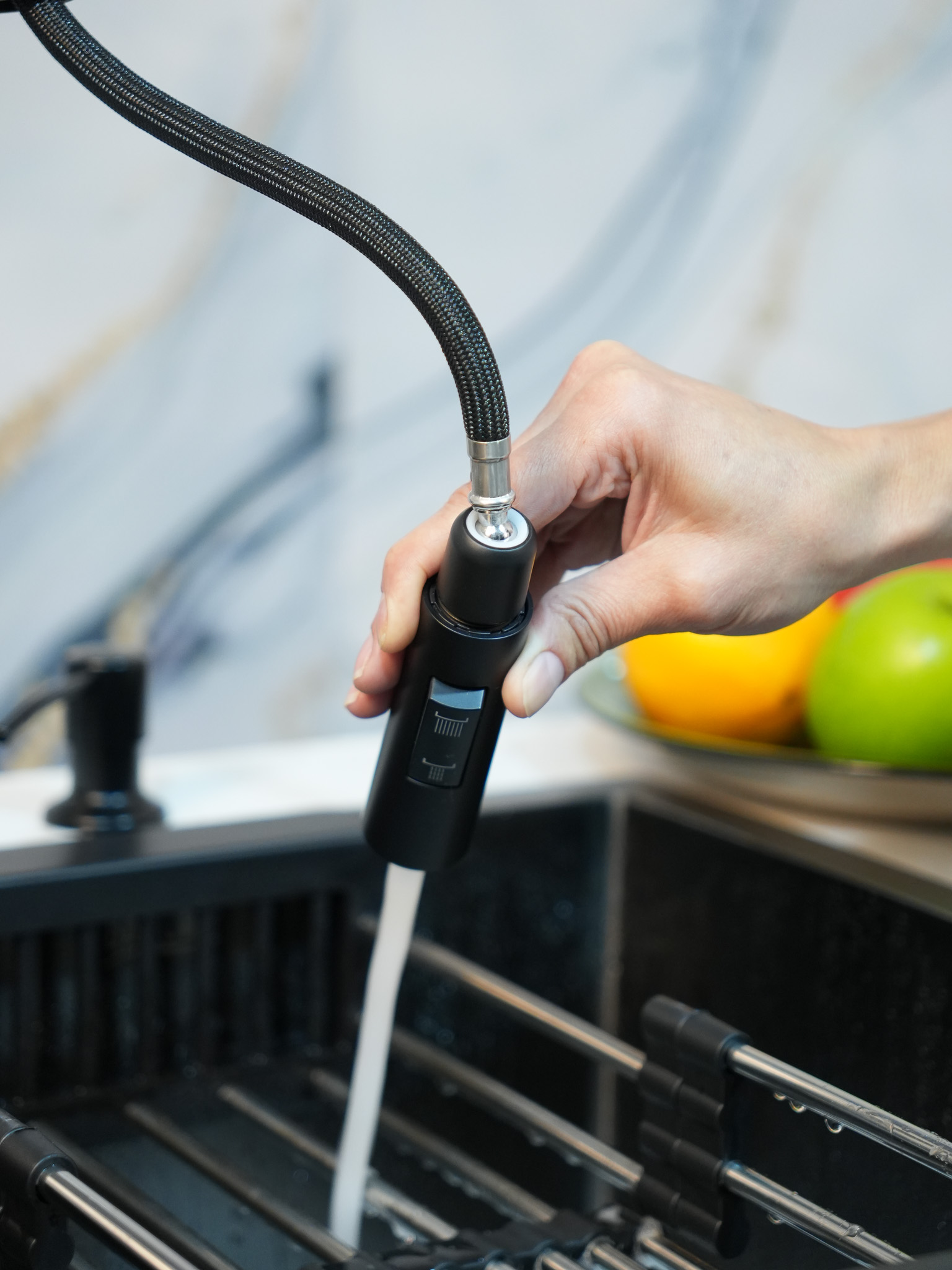 Grifo extraíble fabricado en acero inoxidable 304, extraíble hasta 60cm, poma doble, función chorro y regadera, acabado negro mate.