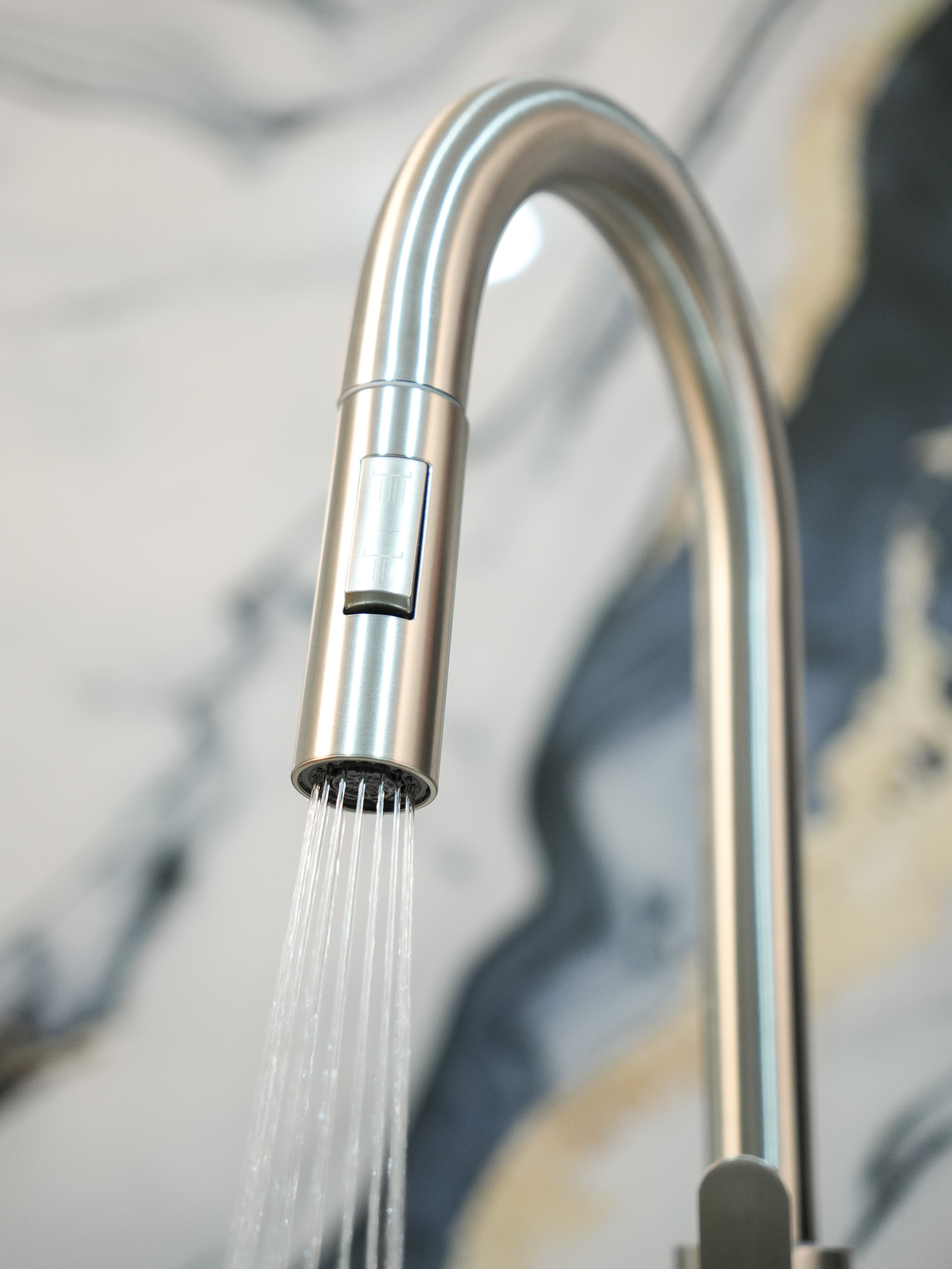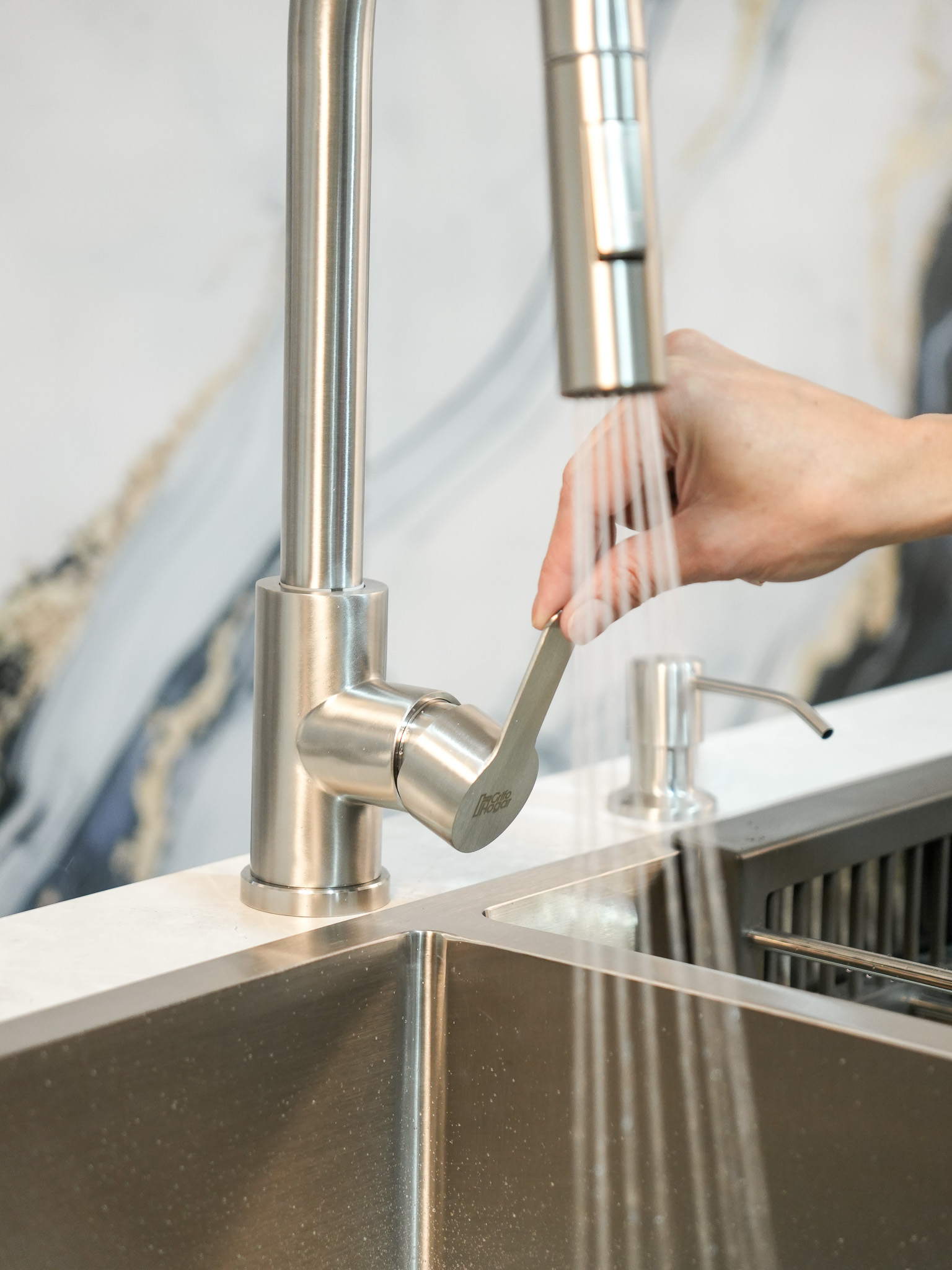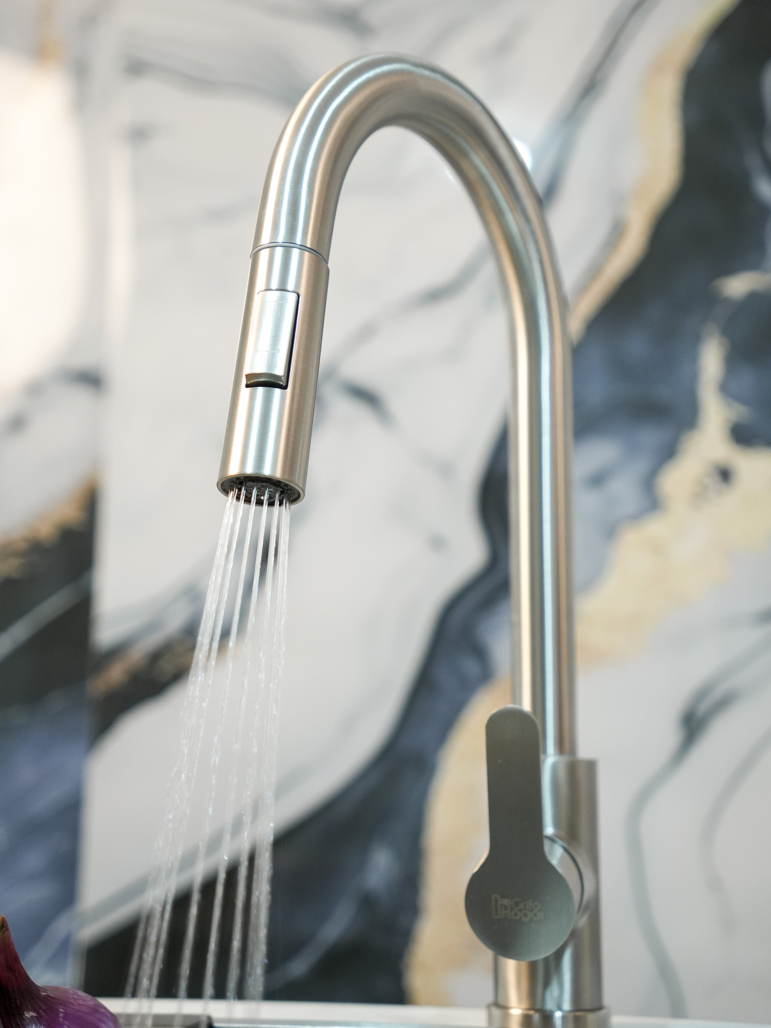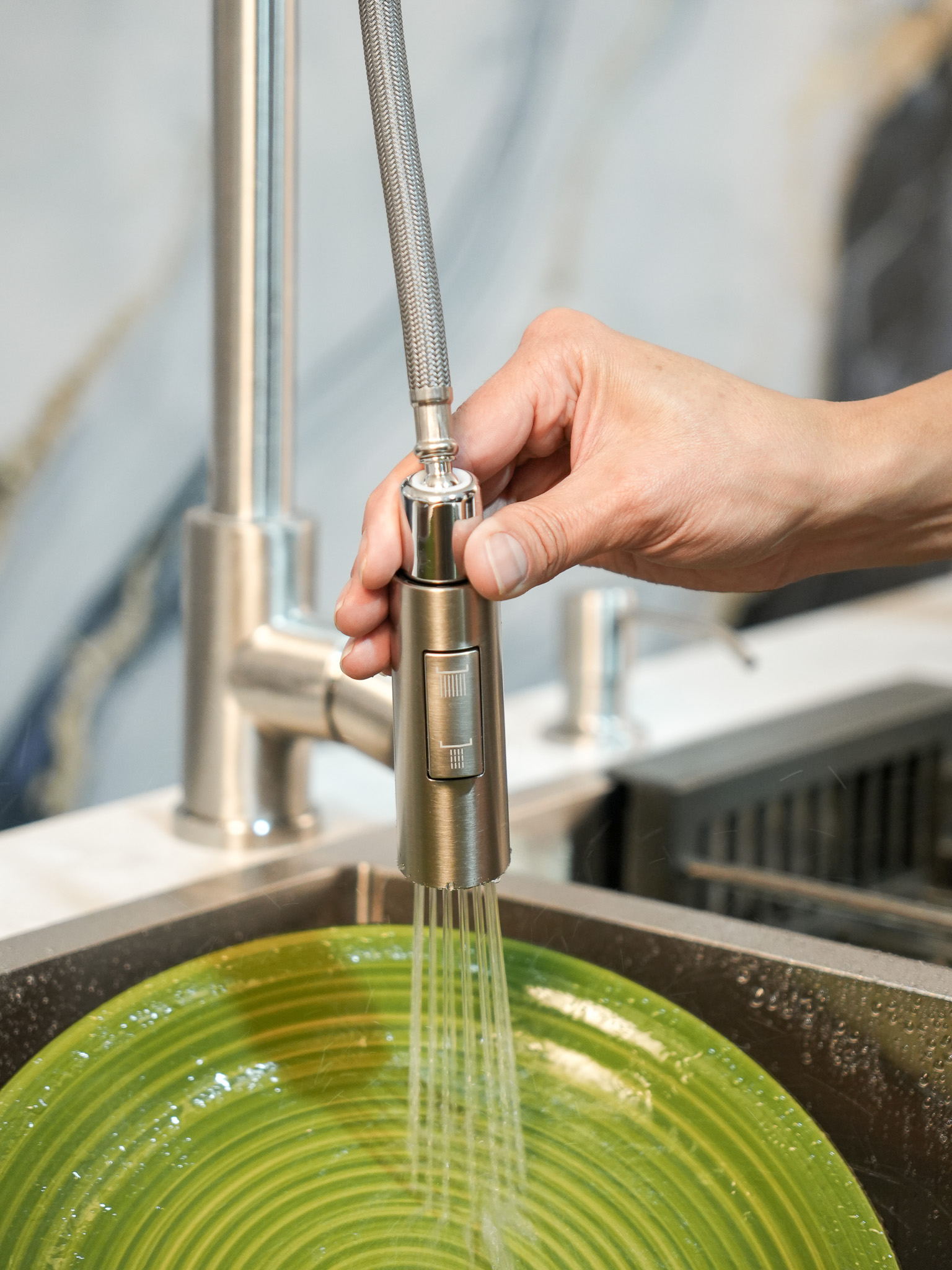 Grifo lavaplatos, Fabricada en acero inoxidable, Diseño innovador de lujo, Extraíble, poma doble, función, chorro y regadera, acabado satinado.