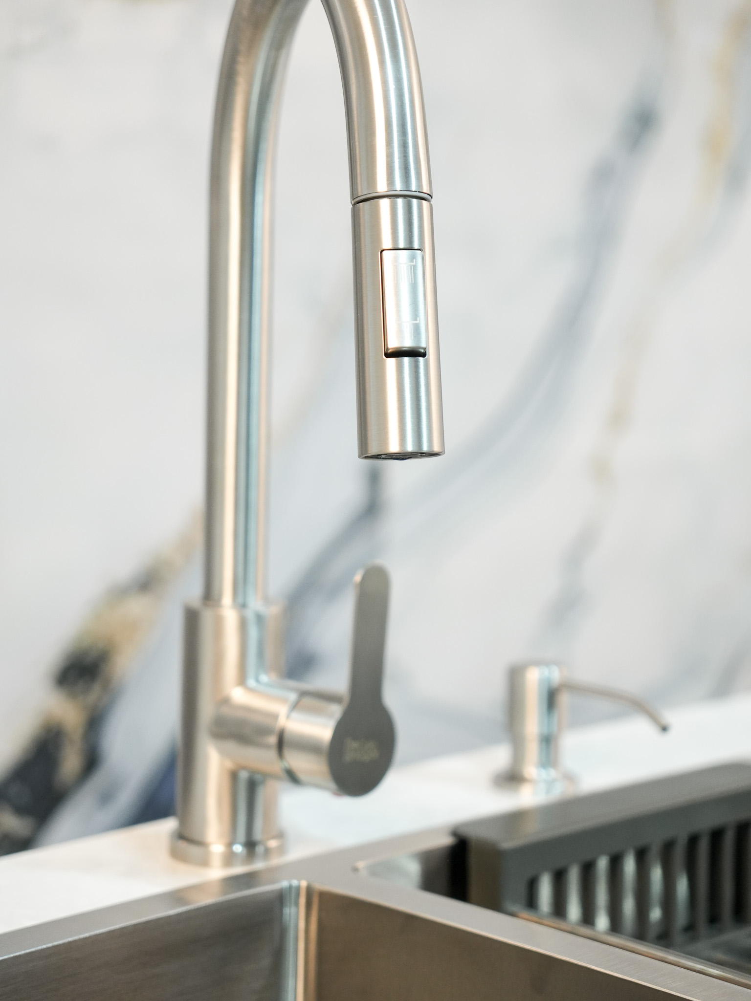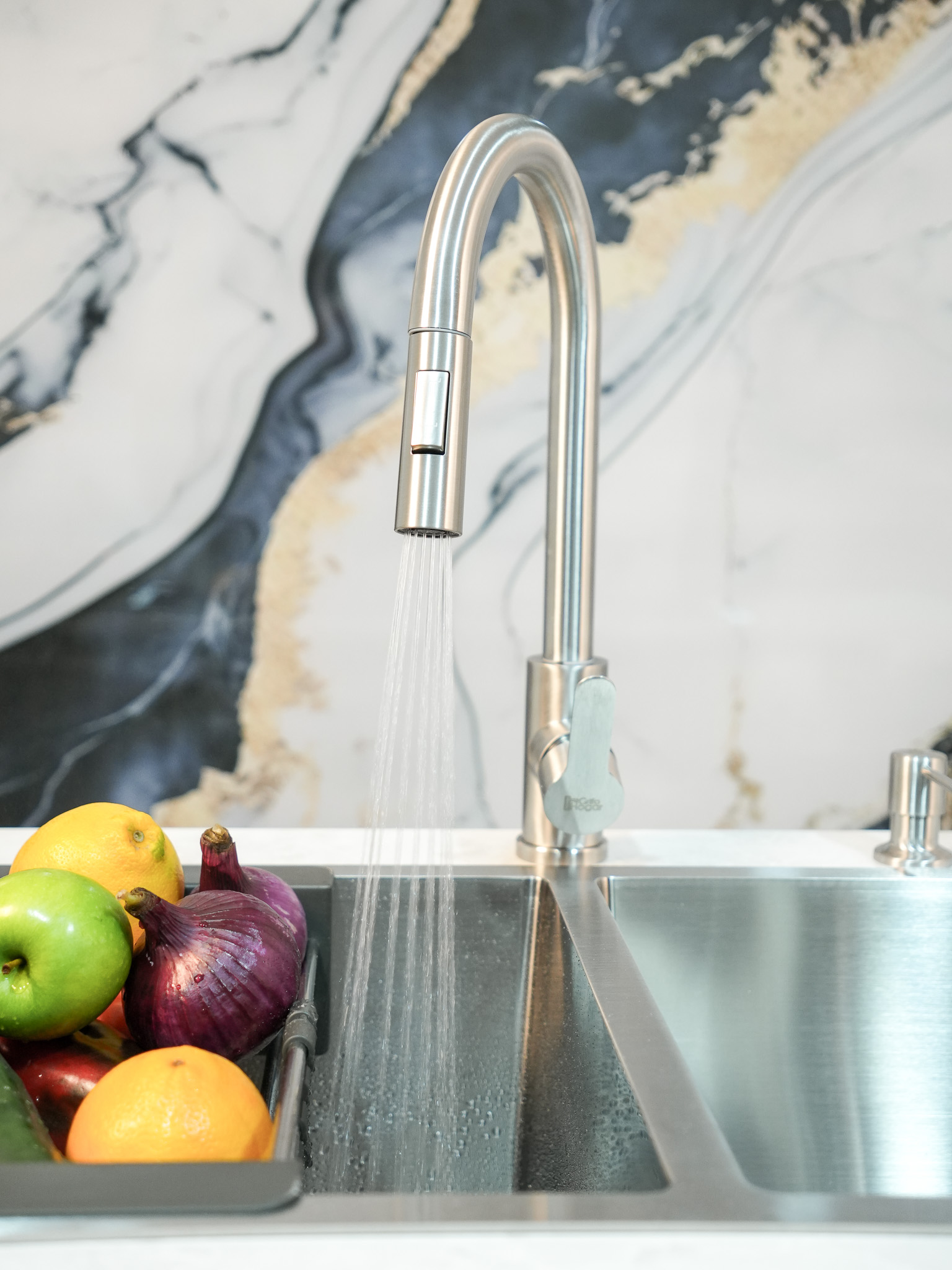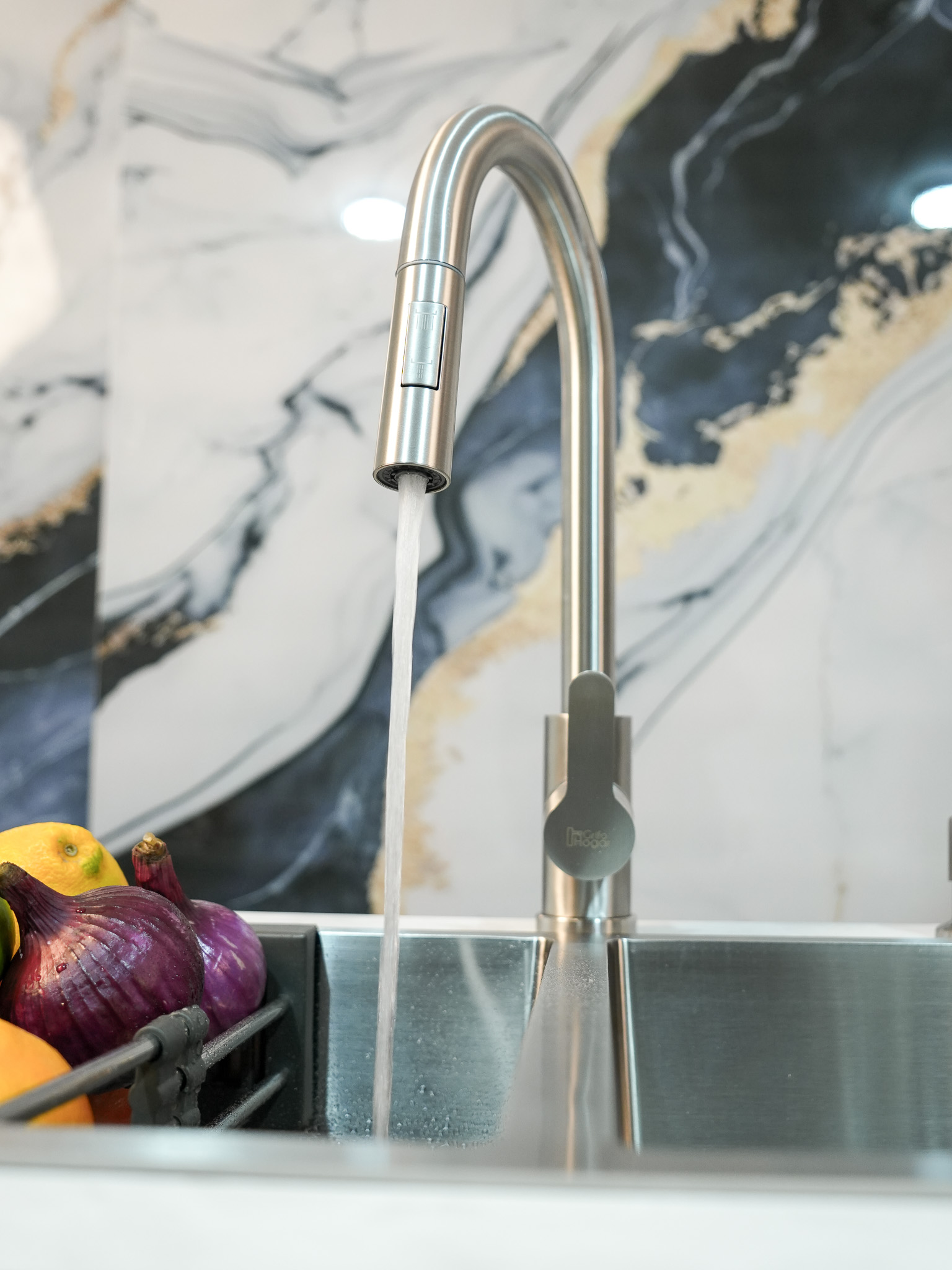 Grifo lavaplatos, Fabricada en acero inoxidable, Diseño innovador de lujo, Extraíble, poma doble, función, chorro y regadera, acabado satinado.