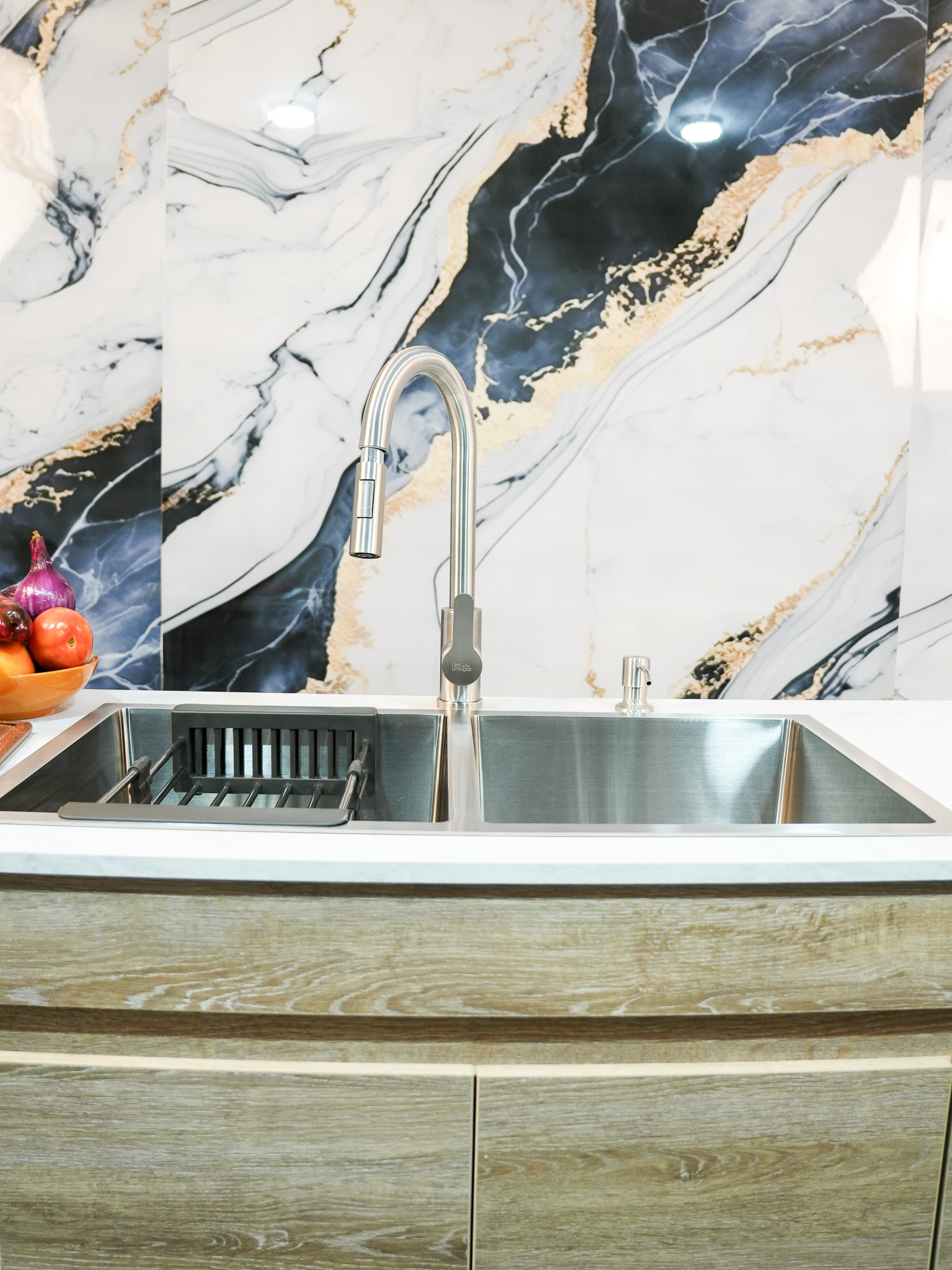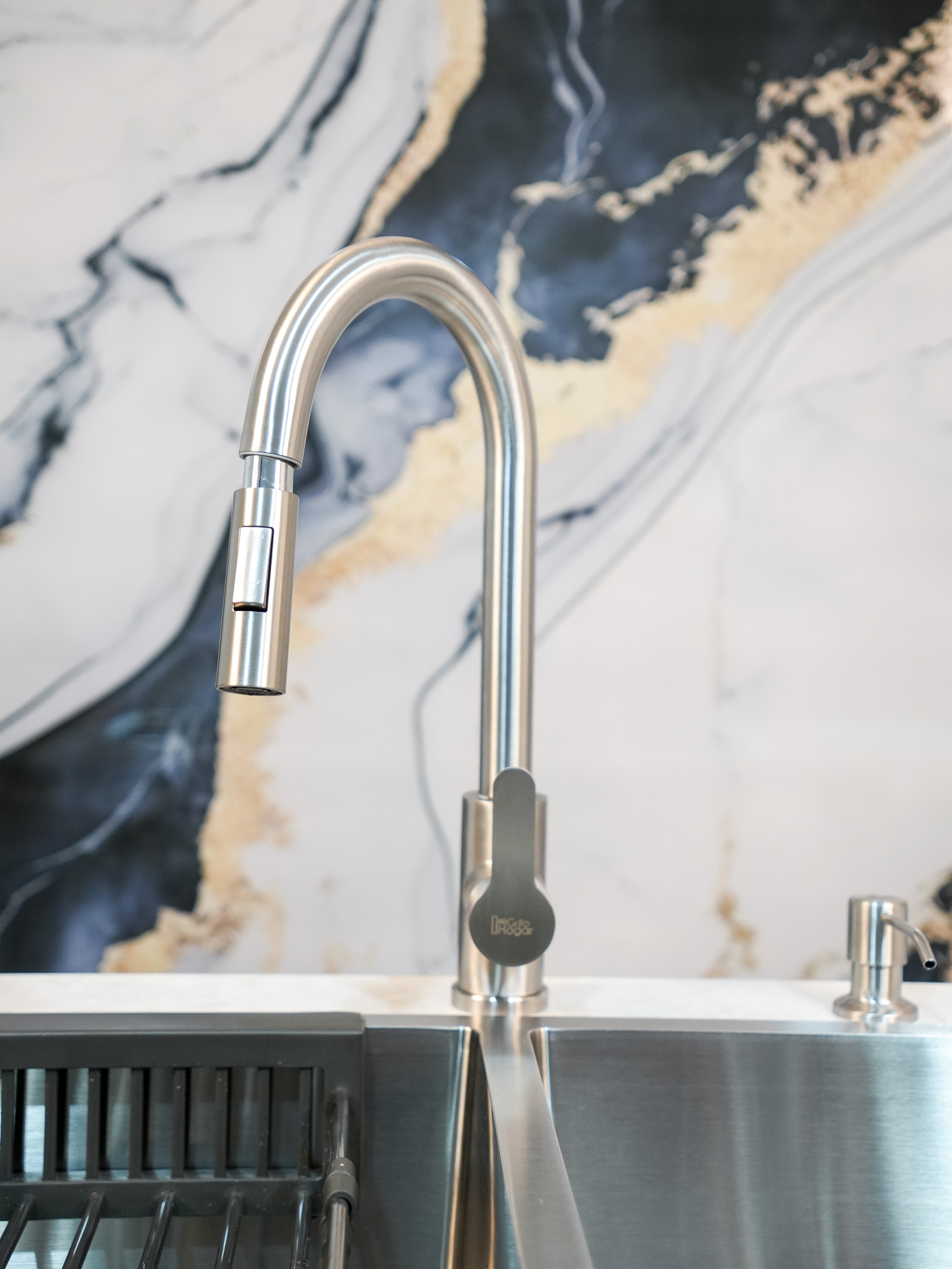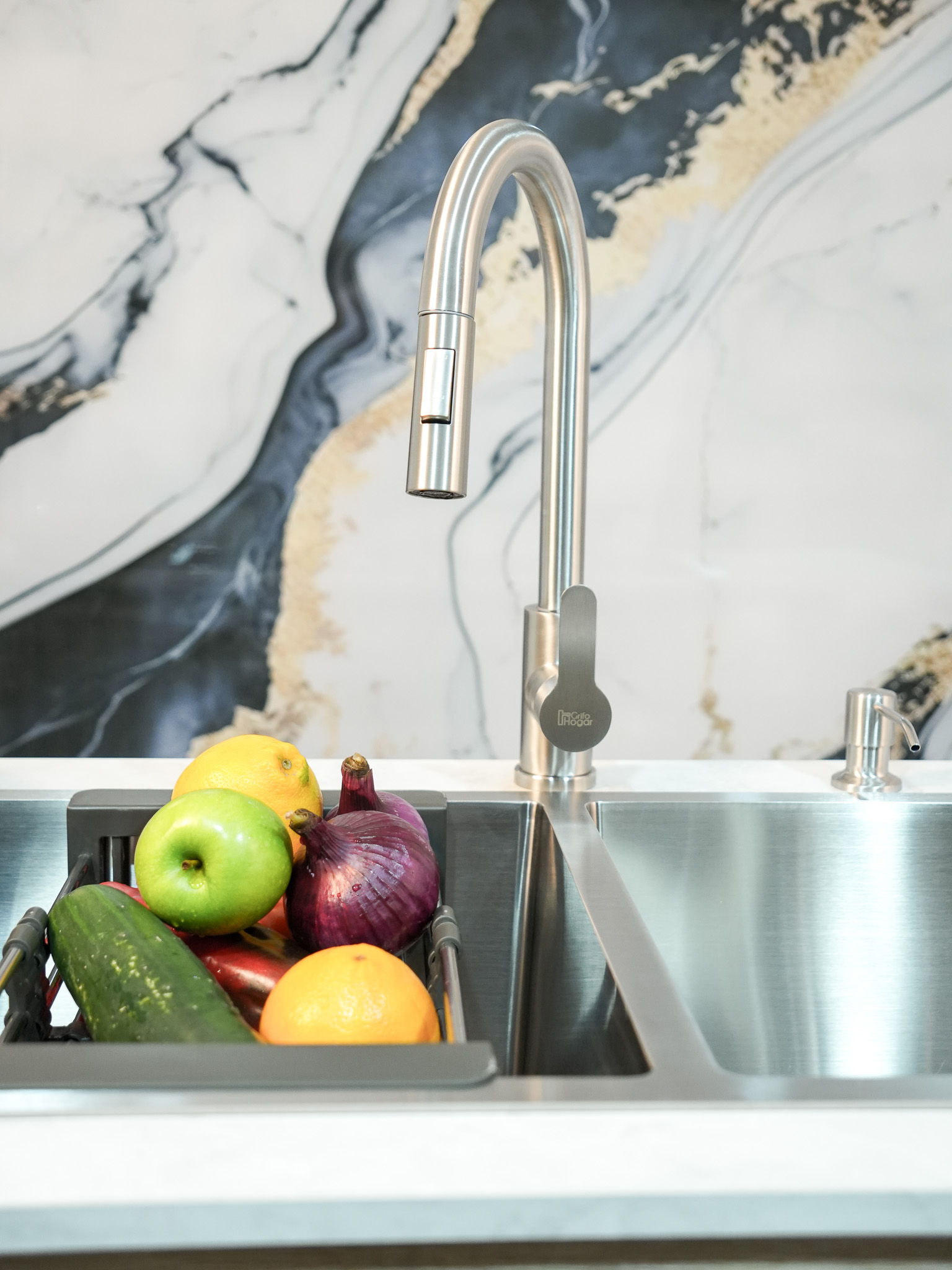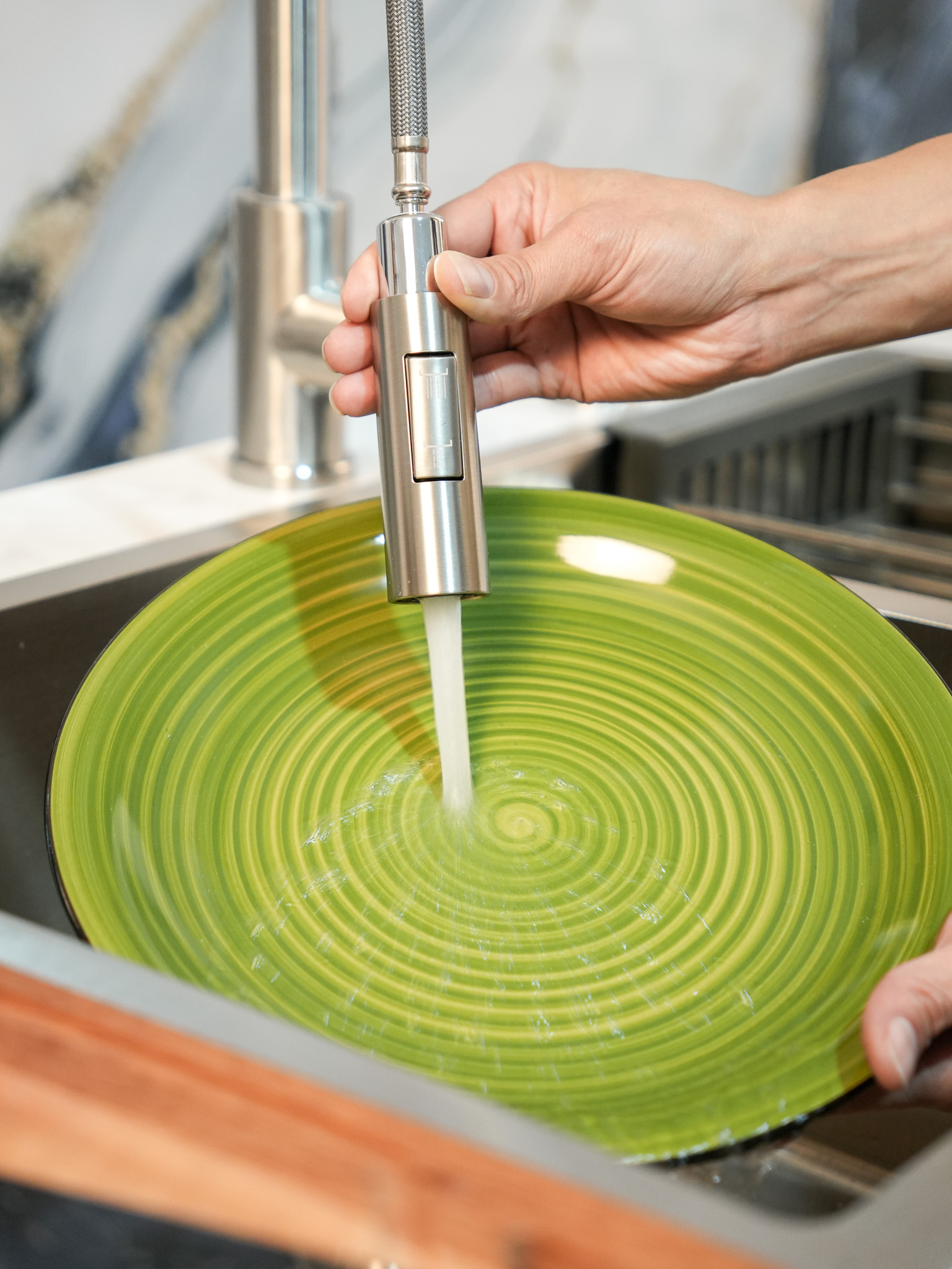 Grifo lavaplatos, Fabricada en acero inoxidable, Diseño innovador de lujo, Extraíble, poma doble, función, chorro y regadera, acabado satinado.
