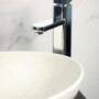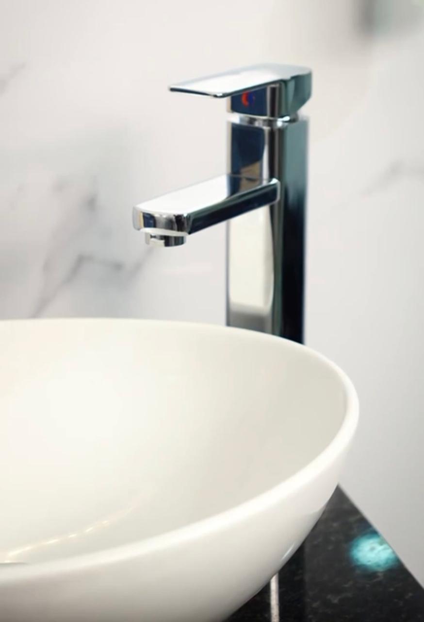 Combo lavamanos tipo estadio blanco en porcelana mas grifería mezcladora monocontrol Galilea cromo y desagüe flex tipo push cromo.