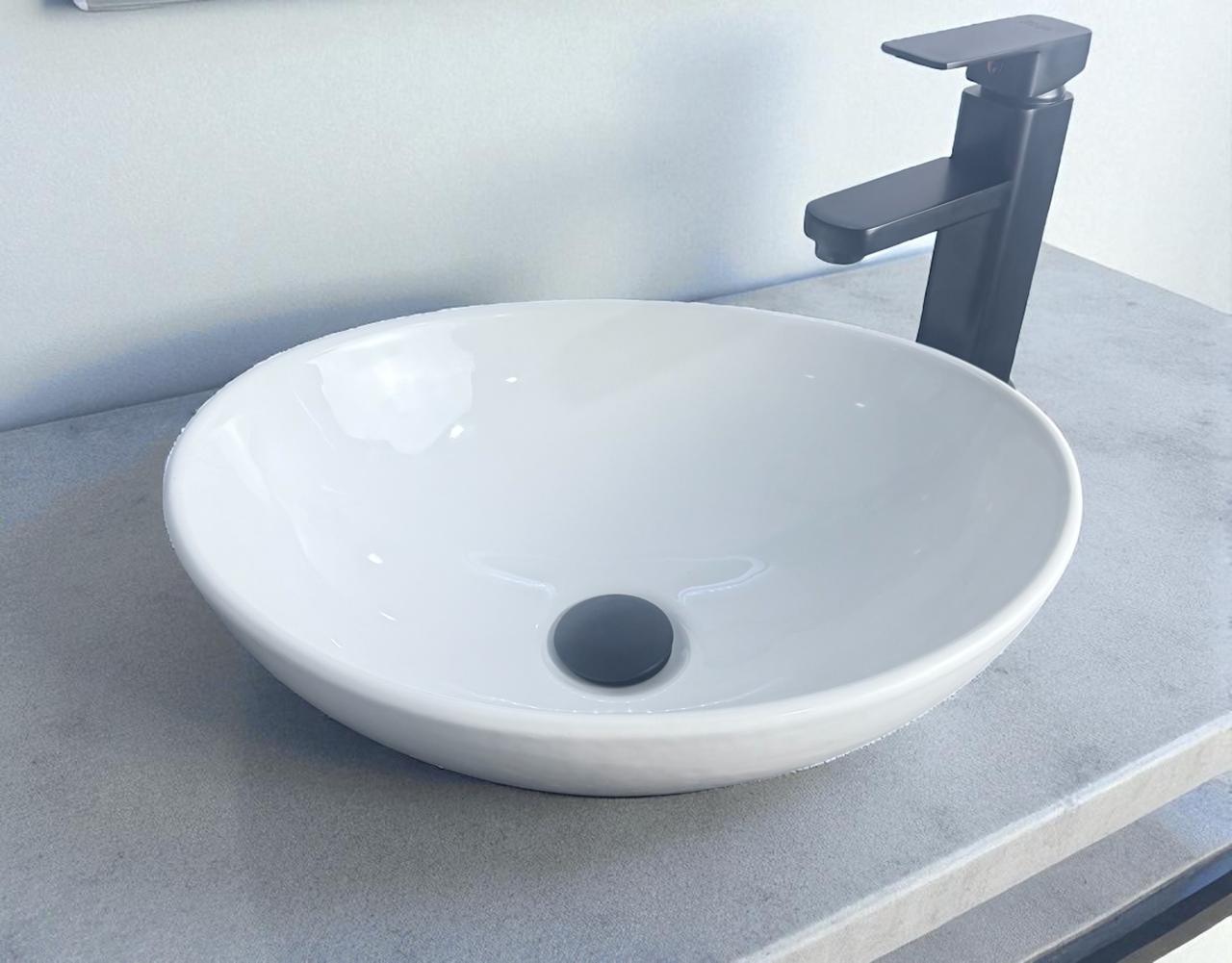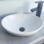 Combo lavamanos redondo 36 cm diámetro blanco en porcelana mas grifería agua fría Valentino negra mate y desagüe flex tipo push negro.