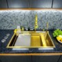 Lavaplatos Moderno Grifo Hogar fabricado en acero inoxidable 304 cuatro teclas, color ORO , nano tecnología para mayor durabilidad con dos cascadas para lavado de frutas y verduras, grifería extraíble, lava vasos, dispensador de jabón. botón pata desagüe, bandejas y tabla para picar, garantía de un año.