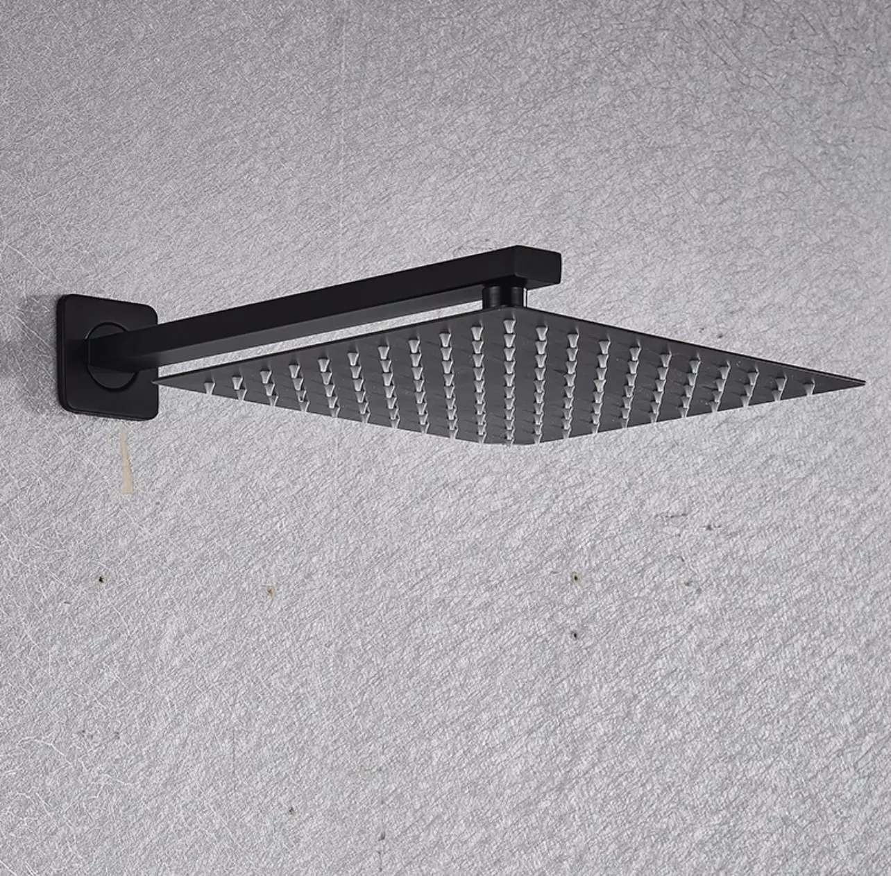 Regadera de 10″ (25cm X 25cm) fabricada en acero inoxidable 304, salida de agua tipo lluvia, acabado negro mate, incluye niple de lujo de 40cm de largo.